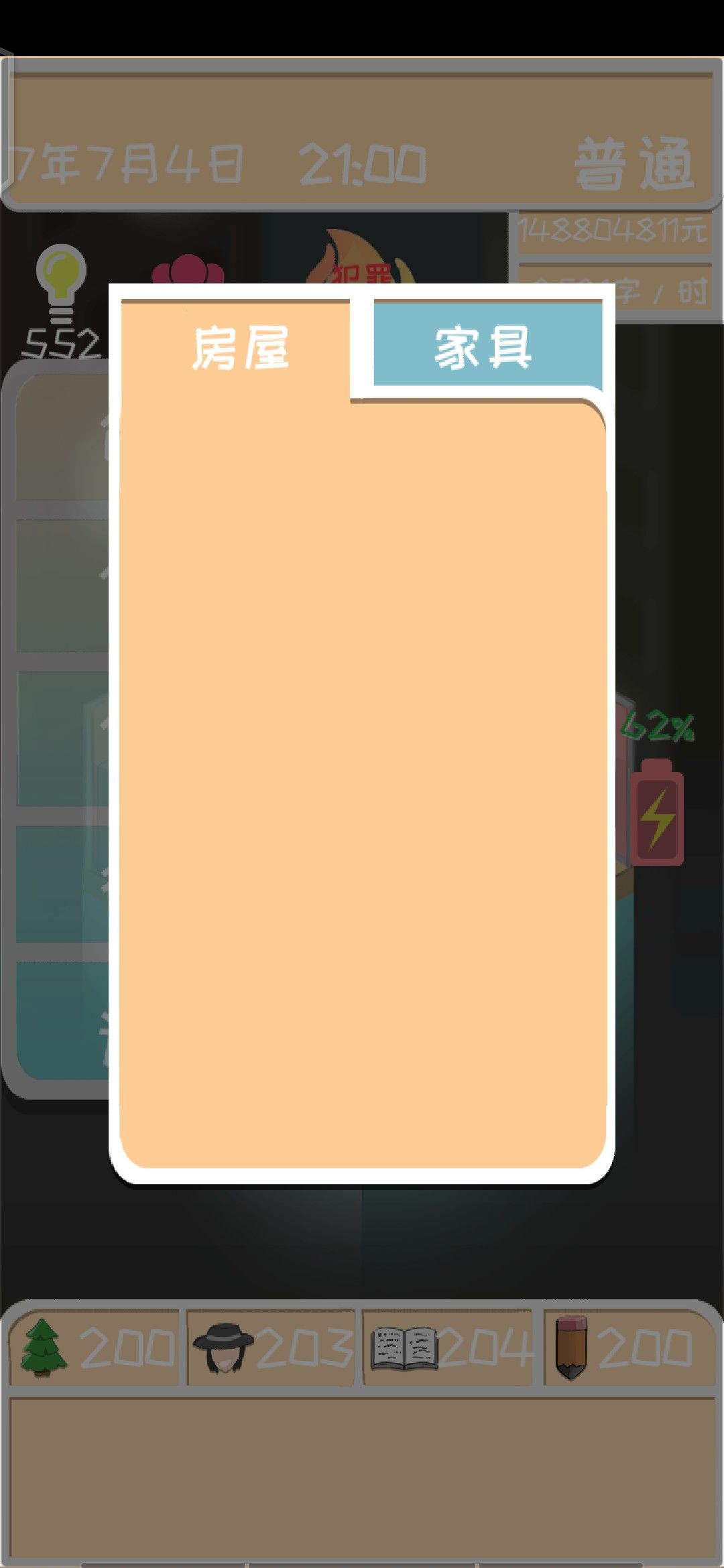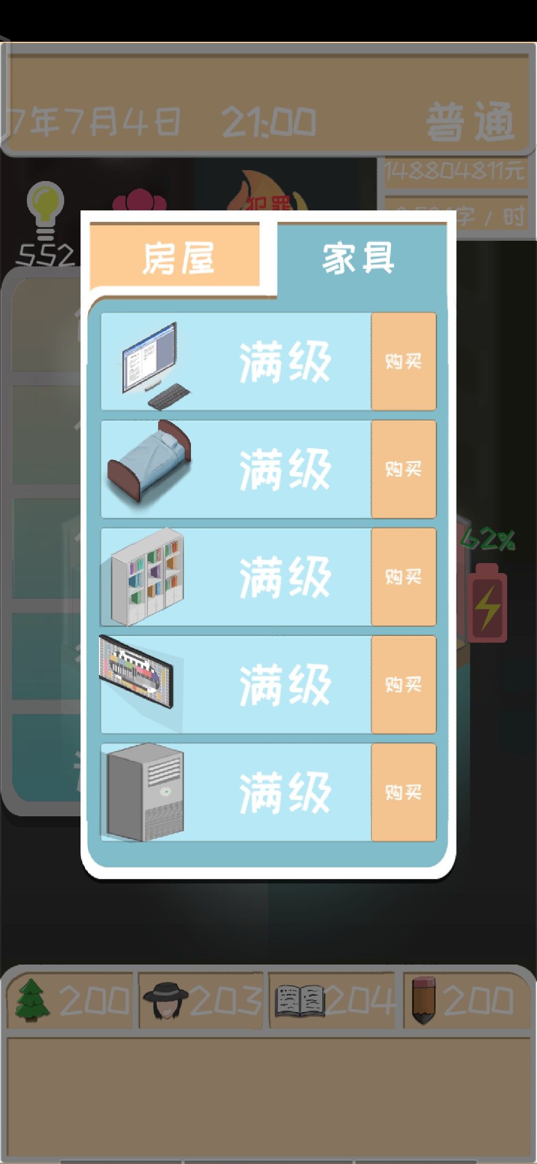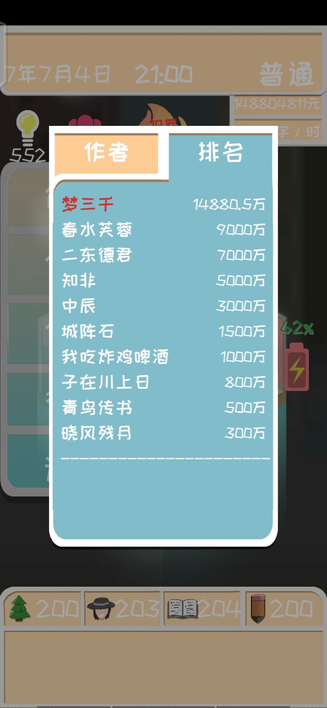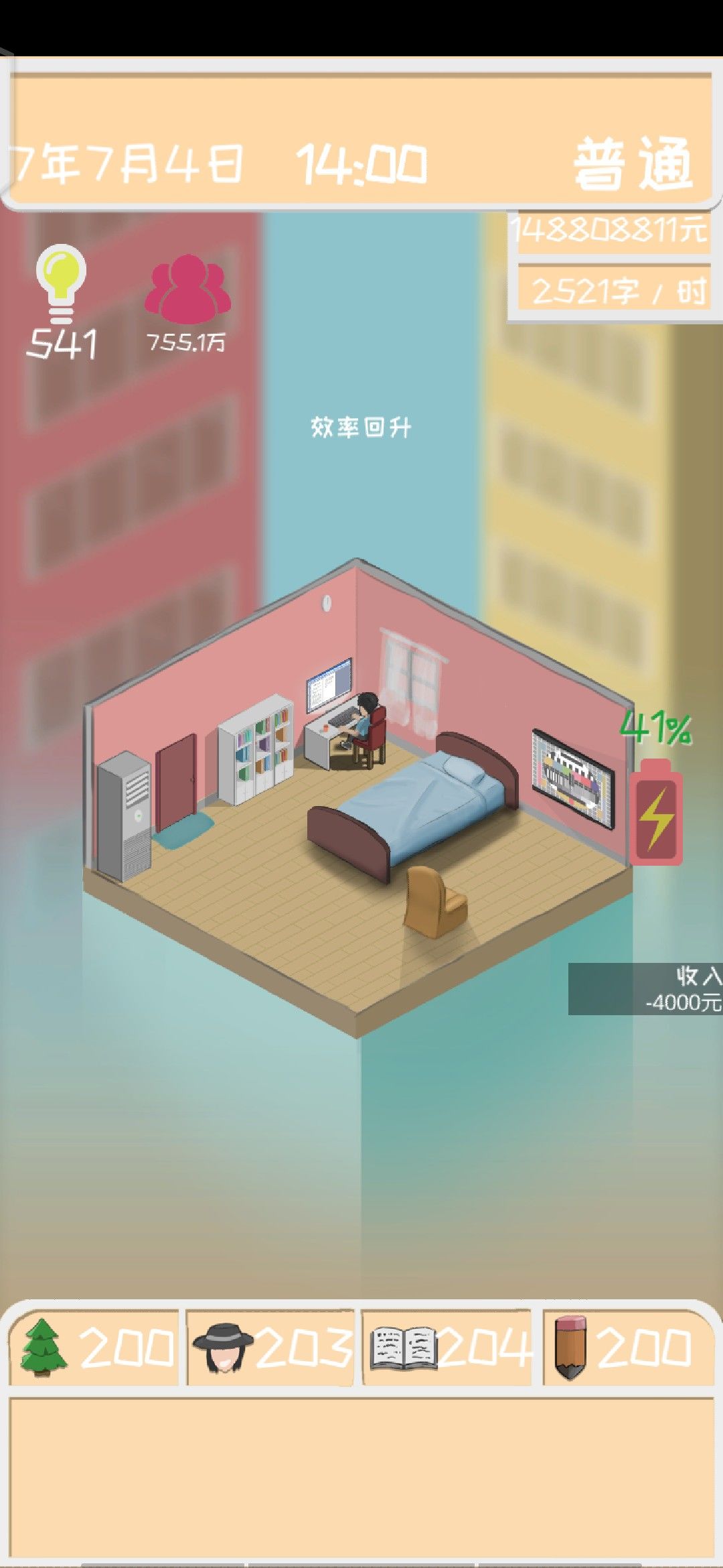 说说我对这个游戏的看法,就是那个过度动画真的是看吐了,画风太单一,玩法也有些单一。但是这个创意非常好,圆了我一个想做一个扑街作者的愿望。希望后面加一些成就系统之类的东西。在加一些随机事件。还有那个图书馆,电影院后面那个演唱会太耗体力了!!!
