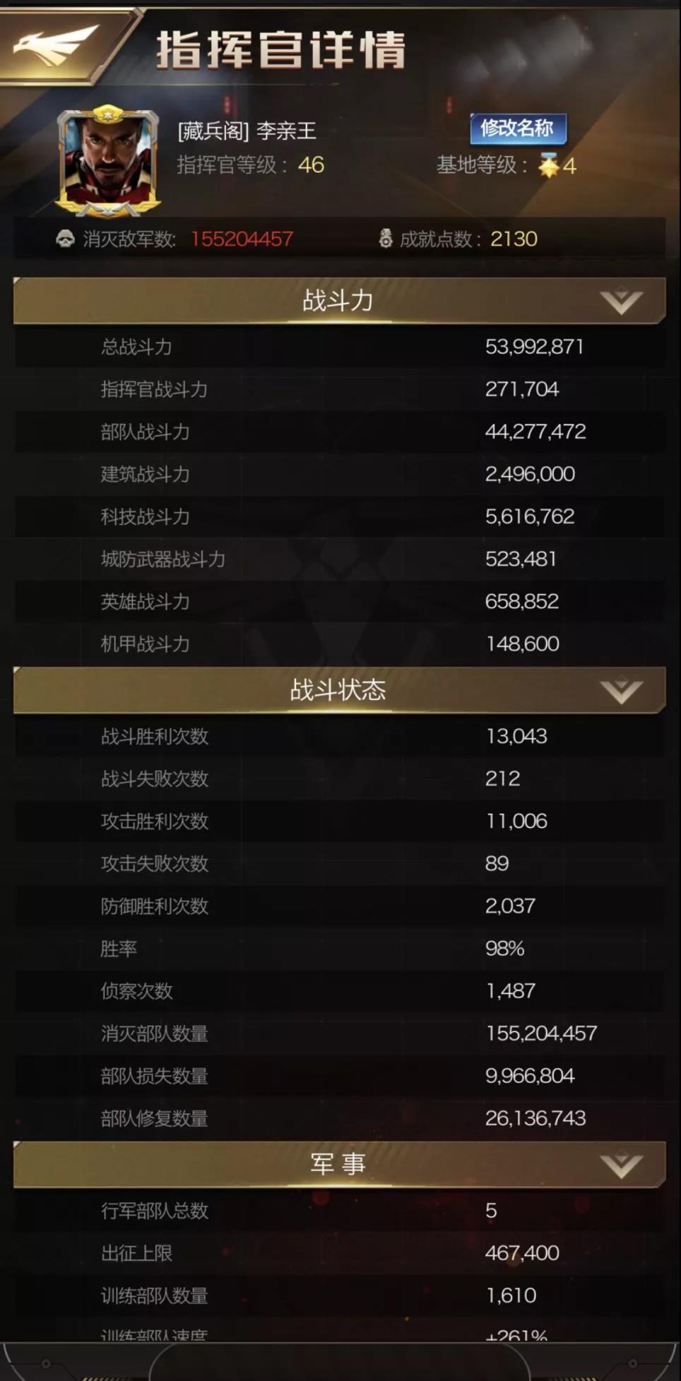 随后我创造了全区多项第一,第一战力,全区第一基地,第一个拥有决斗的指挥官,全区第一个满英雄全英雄五星。虽有万夫莫当之勇,但凭一人之力,八个战区也开始慢慢丢失。在藏兵阁开始败亡之旅时,藏兵阁原班主力人马,在盟友不断电话轰炸下最终妥协,决定回归。就在哗然那一刻,当时全盟每人身上感觉附带所罗门超时空兵效果。这就是我们藏兵阁...