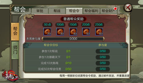 用来在帮会领地兑换奖励的“属地币”除了通过煮酒论武活动获得,还可以通过每周的帮会令领取。每周参与帮会活动可以获得参与度,参与度达到指定数量即可领取“属地币”。领取属地币的多少,就和帮会职位相关了,其所谓责任越大,奖励越多!