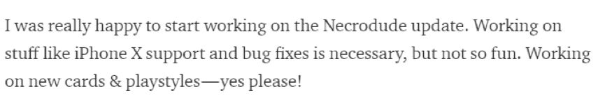 游戏上线以来,我们与海外的独立开发者Eric一起努力修复玩家提到的bug,不断提升游戏体验。当然,就像开发者自己所说的:修改bug,适配iphoneX,ok很有必要,但是很枯燥啊…但是如果是制作新人物的话,那自己是满满的干劲儿呢~