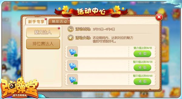活动简介:在活动期间内,玩家只需要达到指定的魅力值即可免费领取海量钻石!魅力达到888之后,总收益高达858钻石。小伙伴们还在等什么呢?赶紧拉上好友互刷一波礼物吧。