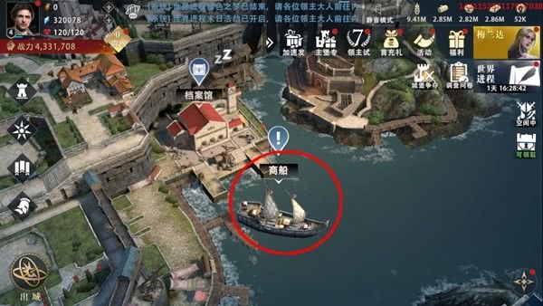 商船并不在主城中,而是在主城右侧的港口位置。在主堡等级达到11级时,领主可以点击港口的商船进行解锁。