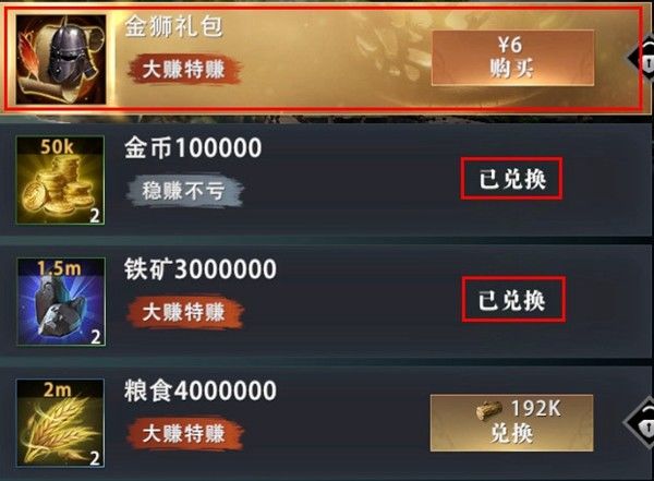 商船刷新后,每种物资只能兑换一次,兑换后界面显示已兑换字样。但领主兑换资源时可几率触发特殊礼包,刷新出金狮礼包等特殊福利,供领主购买。