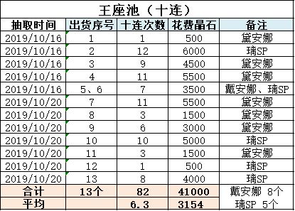 82发十连,共花41000石,出货13个,其中女王8个,熊璃5个。