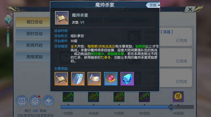 全天开放,但是每周只能挑战一次。坐照境以上的玩家才可以参与挑战,杀宴中魔帅亲自坐镇,迎接大陆中最强队伍的挑战。玩家成功挑战耗时越少,奖励越丰厚,高级伙伴技能、天外印、山河图,境界丹等丰厚奖励等待着玩家来获取。