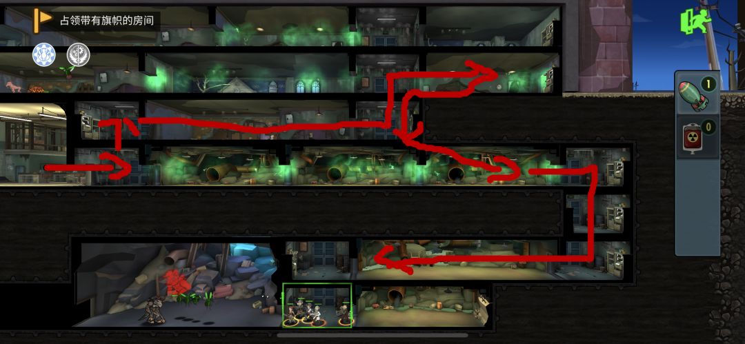 接下来就要面对本图一个另一个难点,在队伍状态不好的情况下要面对好几个辐射房间,而我们选择的路线可以吃一个清除辐射的药,然后最小限度吃到辐射,当然如果有李医生可以选择无视,然后面对的就是第二波小怪,这波小怪要好好利用来打怒气,在全队满怒的情况下更好打,走到boss房门口,扔出炸弹,炸死小怪,记住如果不打绿鼹鼠,没有这个炸弹,十有八九是过不去的,因为后面虫子太多,两轮就能秒了你的后排,最后剩下个废物死爪boss,尽情控制虐待他吧!