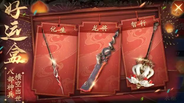使用<青铜爵>即可参与好运盒抽奖,有机会获取护法神兵任选礼(龙将、化生、智行任选其一)、饰品雕琢礼包(金刚钻*1、上古晶石*15任选其一)、护法兵器碎片包、内功任选礼、上品百炼金等珍稀奖励!