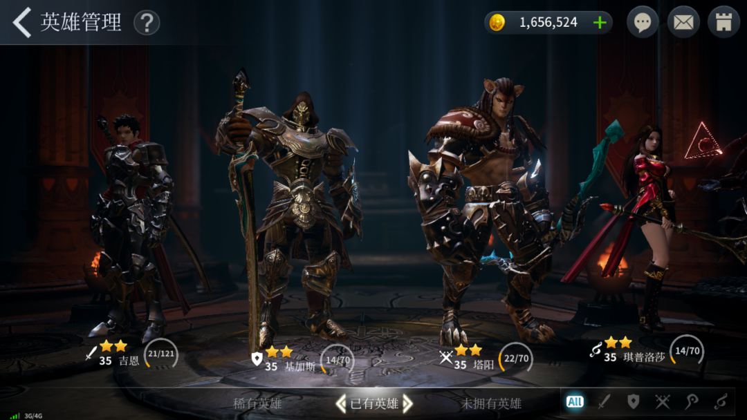 还有,不用急着三星通关所有关卡,英雄升到三十级左右就差不多了,再往后升级装备需要的材料非常多,如果体力都用于刷关卡的话并不划算,三十级左右可以致力于英雄升星,每天的体力都用来扫荡英雄遗产比较好,如果想升级的话可以自动战斗英雄遗产,不建议狂刷关卡。