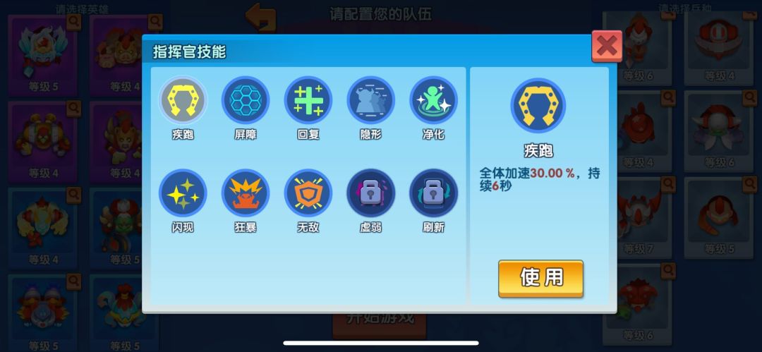 阵容确定好后,我们接下来选择指挥官技能,也就是所谓的“通用技能”。目前游戏内有10种指挥官技能,需要角色达到相应等级便可以自动解锁。指挥官技能是我们的锦囊妙计,在战斗关键时刻可以起到至关重要的作用。但也不要随意释放,因为它拥有着较长的冷却CD,切记切记!