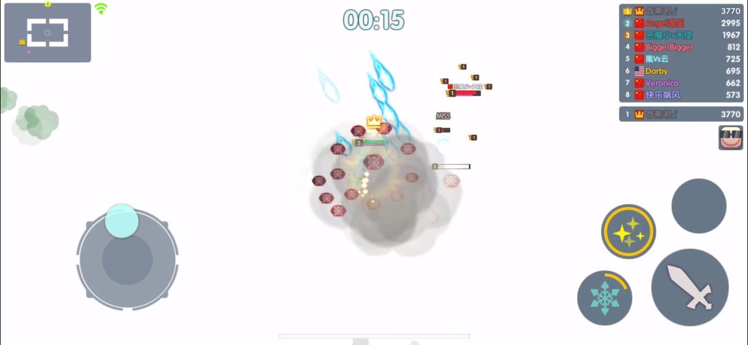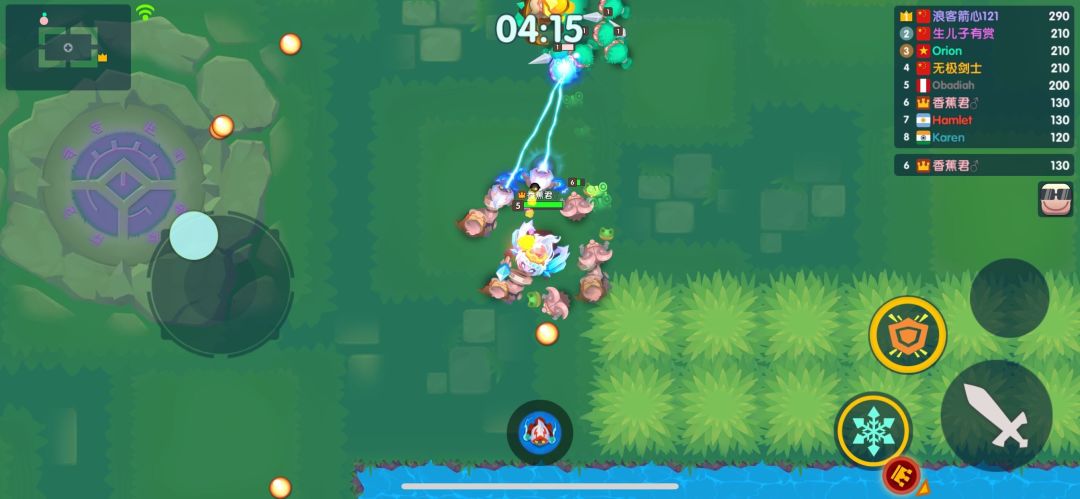 游戏采用的是经典的轮盘+虚拟按键的控制模式,即左屏移动+右屏进行攻击及释放技能的操作模式。游戏开始时,我们控制英雄在地图上自由行动,与球球以及贪吃蛇大作战类似,需要寻找收集地图上的资源(豆子)不断变大变强,我们要做的就是抢夺更多的资源,消灭遇到的所有敌人。前期建议优先收集地图上的资源,积攒兵力,等拥有一定兵力时再去找时机争夺敌人的资源。