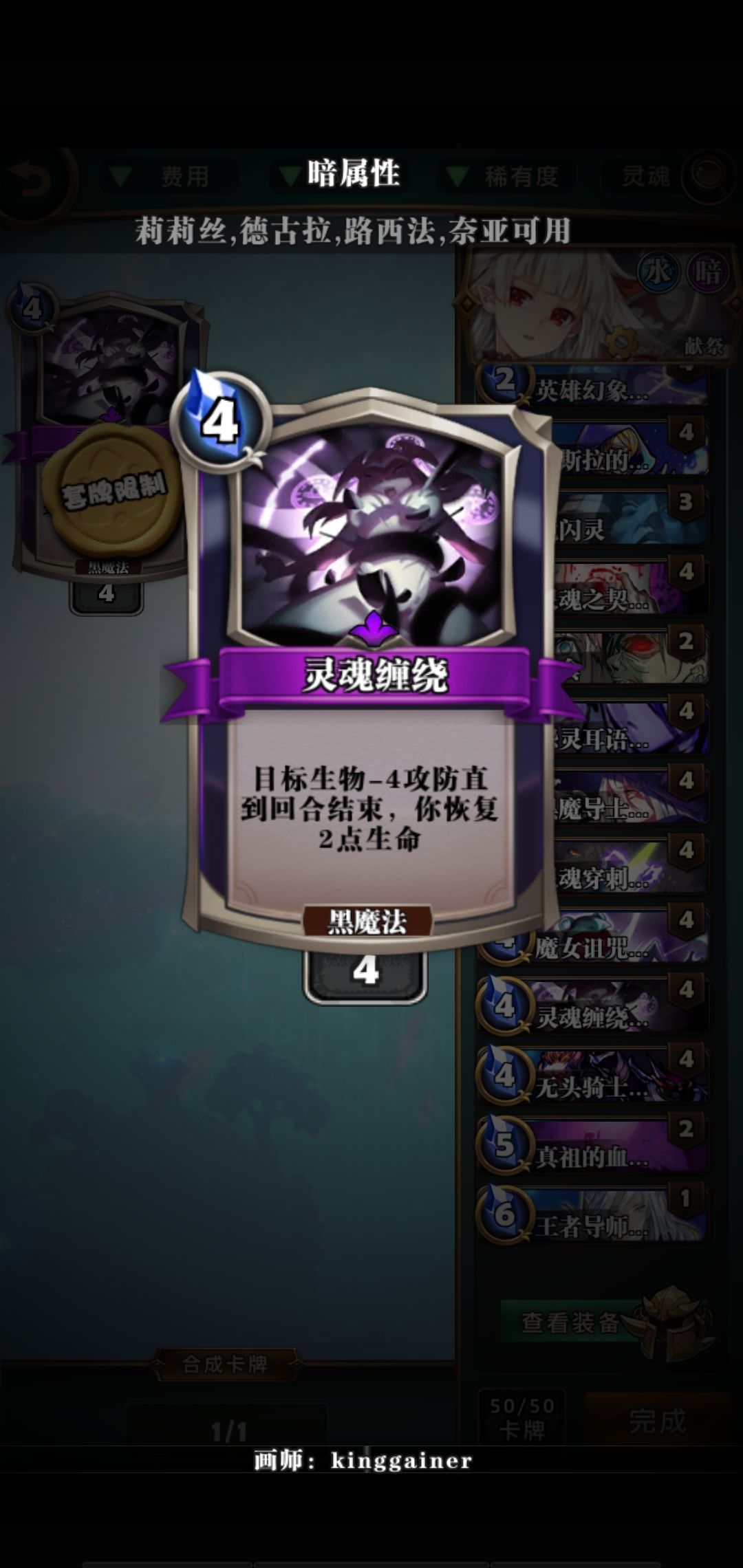 【灵魂缠绕】:生物-4-4回复生命2 【优点】 : 对不朽有一定的压制作用,法术失败也会回复2生命值 【缺点】:融合可以避免被解掉,下回合会恢复原本的伤害值,对巨龙无效不会造成伤害】【触手差评】【技巧】:作为一张没有孤注的卡可以各种意义上的备选 。 【提示】:备选是选择目标死亡之后法术随机选择敌方目标有益buff随机选择友方