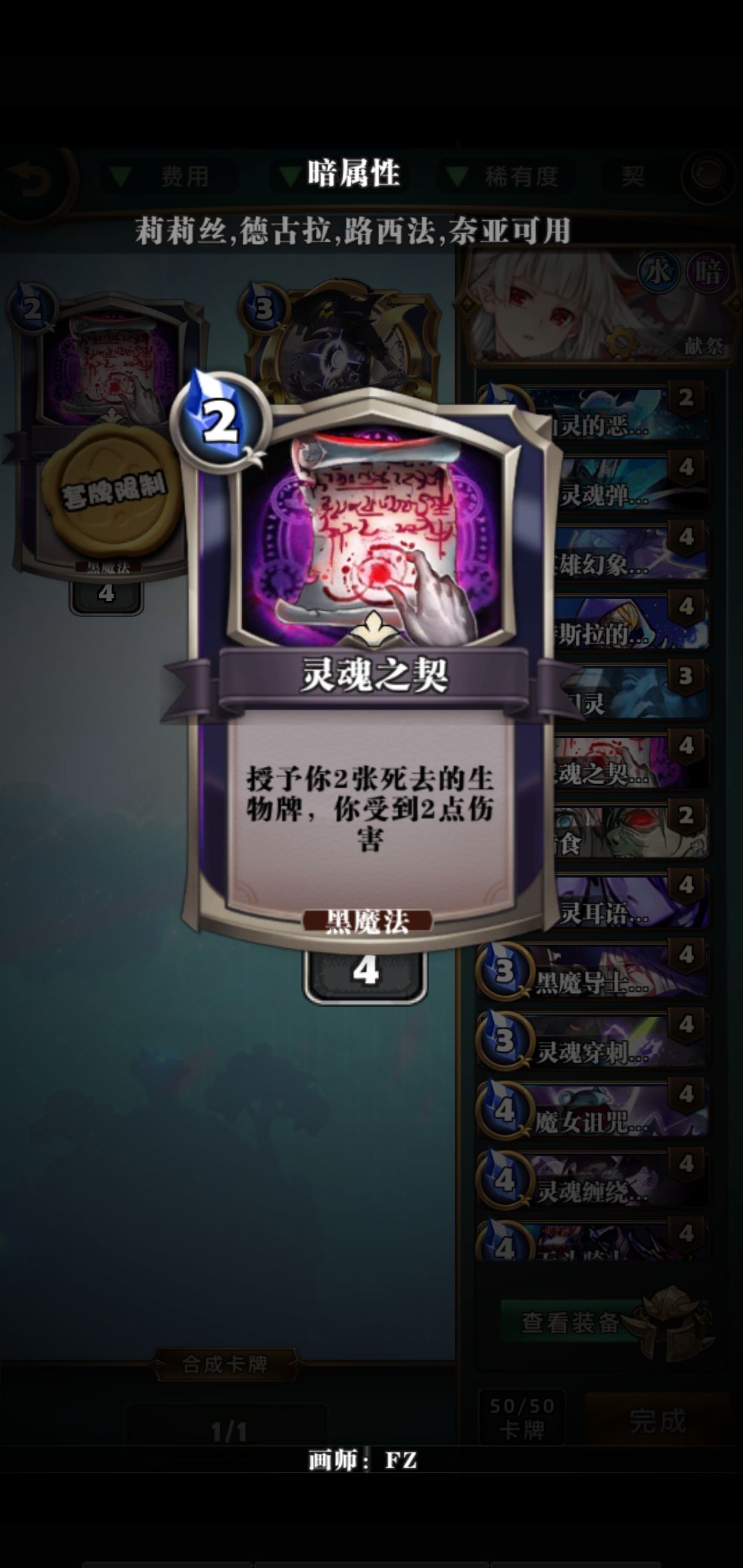 灵魂之契】:授予你2两张失去的生物牌受到同等于授予牌的等量伤害 【优点】:可以拿回失去的融合生物进一步融合加大黑色的残缺生物质量 【缺点】:随机性,伤害性会触发对面特殊效果生物加成, 【梦茜】额外的手牌有助于爆牌,爆牌更健康哦(◕ˇ∀ˇ◕)开心的笑 【技巧】:开局留同名卡融合被解掉之后拿回两张然后融合3级用来压制拿回主动权【提示】:小心威仪,胁迫,金发,崩坏,魔眼,青蛙,剑栏,等