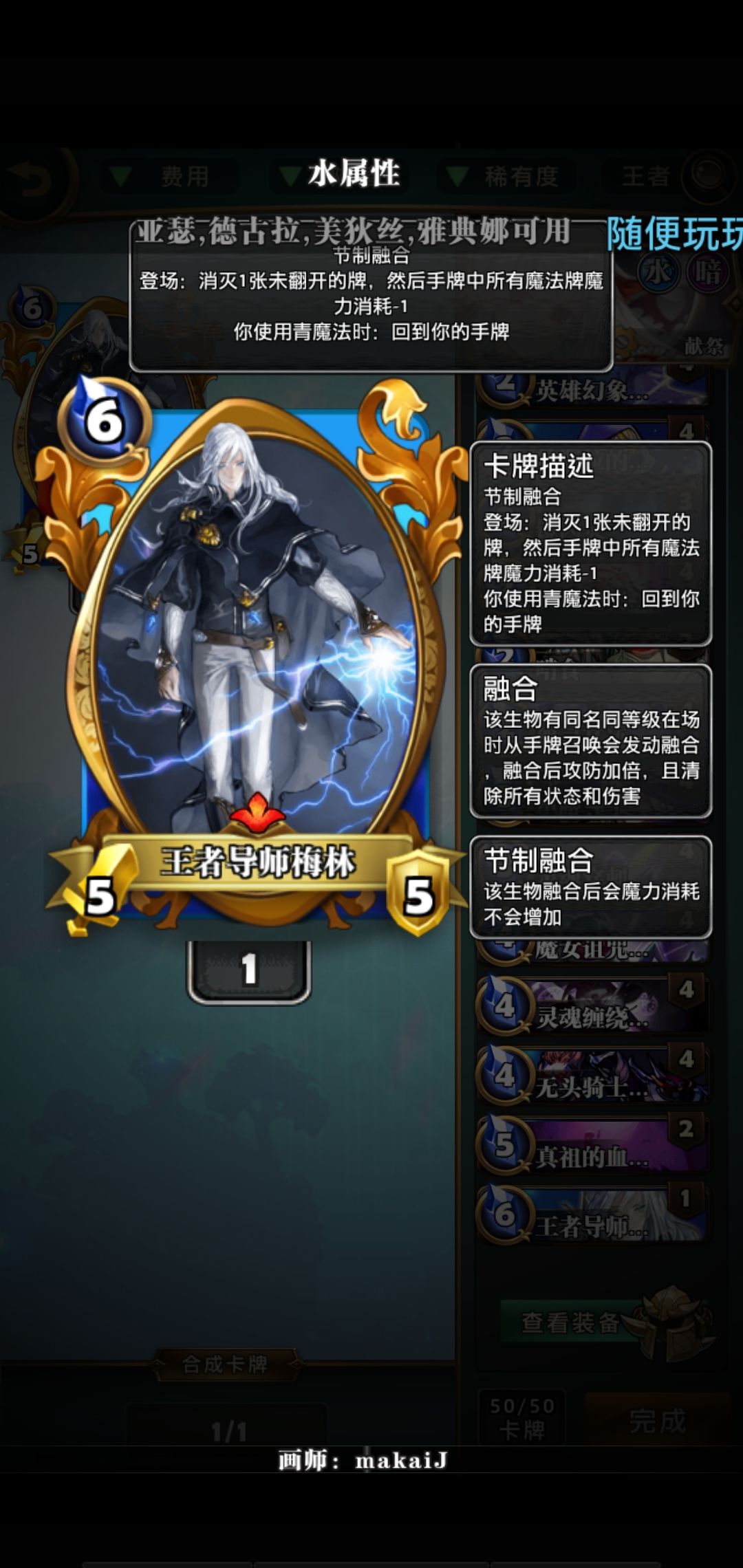 【王者导师梅林】:入场破坏一张盖牌,手牌法术费用减1,如果是【梦茜】推荐的卡组法术可以组合连续减费直到低阶法术消耗0 【优点】:1-2位置很强,全体法术减费对纯法师实用性很高,使用青魔法可以回手2次入场 【缺点】限制了青魔法,会各种回手自己失误被换血,也会急躁导致【王者导师魔林】被换掉消灭 【技巧】:多次使用青魔法回手会给对手造成一定的压力, 【提示】:如果对手生物费用很多或者,死神剑栏,速攻,巨龙 也会òᆺó反压制 消耗我方手牌 。 【梦茜】:这是最后一次了【王者导师梅林】:是一个好老师学习就像一场游戏,一个好的老师不是会教你怎么使用法术,而是教你怎么使用划算,保护好自己也保护好老师(。í _ ì。) 不要对不起梅林,如果你可以见到导师帮我谢谢导师,真的很需要导师的关怀 【烦恼】 :内容加入了一些日常聊天,青春期的烦恼真的好多 ,说出来一点好多了 (/^▽^)/ 【祝福全体玩家游戏愉快】:ノBye~