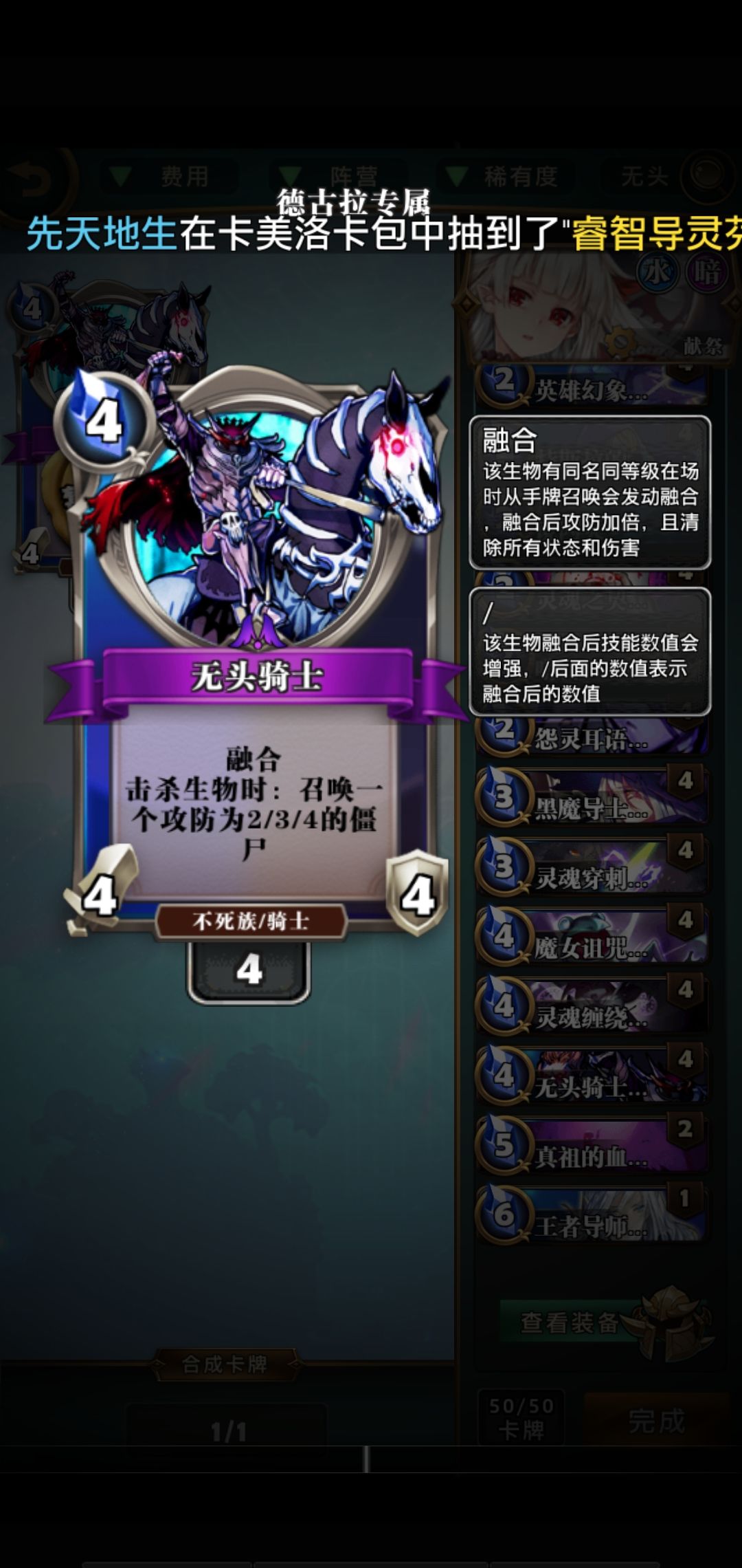 【无头骑士】:杀死生物可以召唤一个僵尸 【优点】:杀死目标和目标主动攻击死亡都可以召唤僵尸,自己被点燃杀死也会召唤僵尸 【梦茜】:除了召唤僵尸你还会什么呀(◦˙▽˙◦) 【无头骑士】:僵尸会污染墓地,影响双子,灵魂之契,随机墓地复活技能 【技巧】:放在前面中间或者左边,杀死生物召唤的僵尸会再右边6号位置默认生成融合可以加强僵尸的力量【提示】:过度的污染牌库,和卡位会对战局造成一定的未知影响也许这也是魅力之一吧。