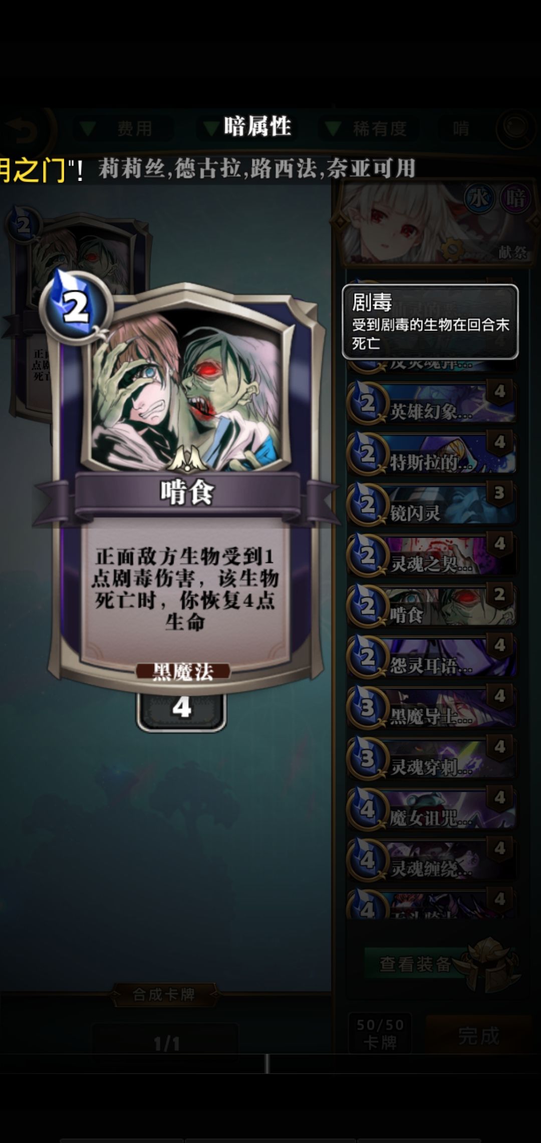 【怨灵耳语】:复制敌方手牌一张,如果有不死族会额外复制一张【德古拉】唯一拿的出手的几张牌之一 【优点】和大佬比赛可以获得大佬的金色卡牌补充自己的贫穷掩盖自己是菜鸡的事实 。 【梦茜】:才不会承认自己也是菜鸡,咕咕咕 , 【闺蜜】:白眼 【梦茜】:不听我不听,写作业去了 【缺点】:会污染手牌一些比自己弱的人的卡会降低自己的下限,因为有些卡需要比如科学家,天使,在手中只有一张的情况下不会生效,在手牌会爆牌下场会污染【灵魂之契】:的稳定性 【技巧】:用来看敌方手牌根据敌方手牌组成来判断敌方是什么卡组核心, 【提示】:根据敌方卡组核心和手牌来判断敌方下一张盖牌是什么是德古拉的必修课