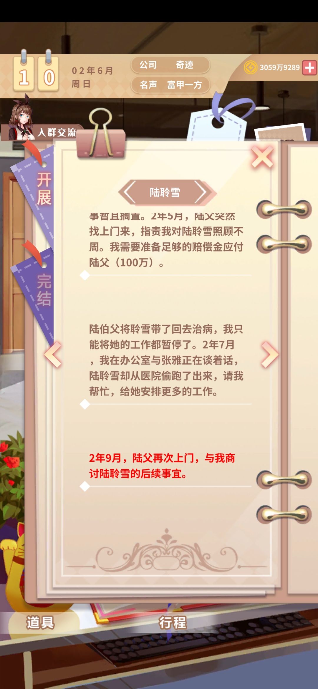 触发雪2年7月从医院跑出来事件后卡在办公室界面,没有任何图标。只能强制退出后重新进入游戏,时间显示为上图6月时间。但所有通告是按正常7月的的进度进行的。