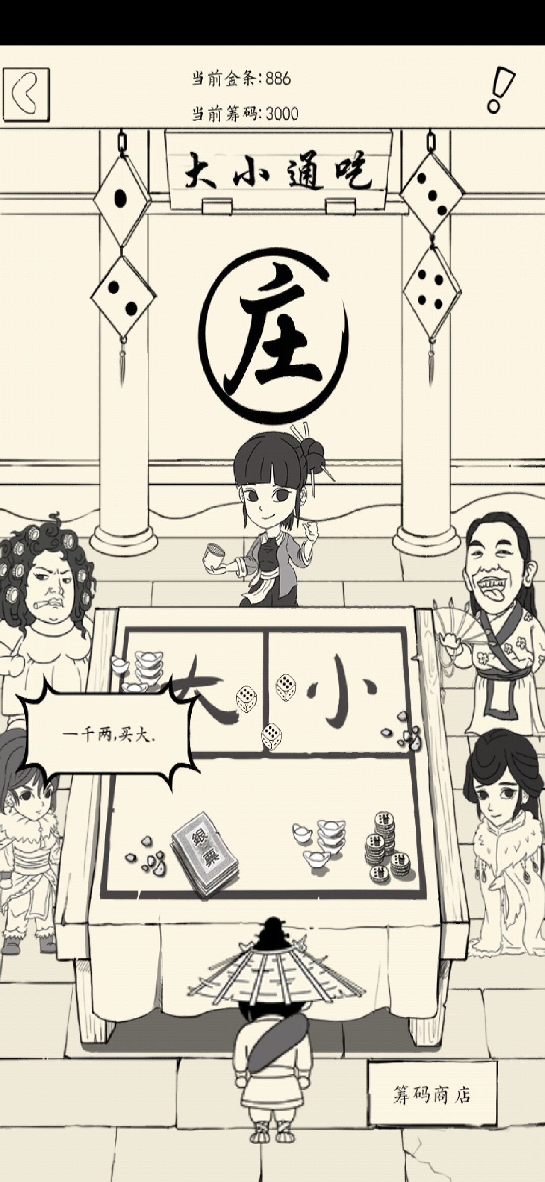 花二十金条,两千筹码。第一次随便押,从第二次开始,上一局是大,跟着押大。上局是小就跟着押小,一次只押100。