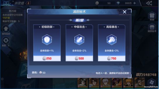 瀞灵塔挑战这么辛苦,当然少不了浦原店长的帮助了。每层关卡都可以花费一定的探索币购买浦原秘术。浦原秘术会提供攻击力、暴力、命中、防御、闪避等属性的加成,根据自己的队伍,选择合理的秘术buff,可以大幅提升我方的战斗力。