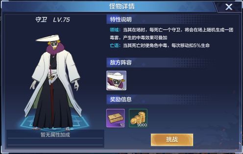 瀞灵塔的小怪带有各种神奇的能力,例如:光环怪(在场时,场上所有小怪攻击力提升),亡语怪(死亡后,其他小怪攻击力提升),毒素怪(在场时,每次击杀怪物都会在随机一个格子生成一团毒素,走上去后会损失我方生命)。根据怪物能力,合理制定击杀小怪的方案,可以大大帮助你提高通关成功率。