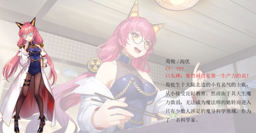 荀攸(洵优)生于大陆北边的小有名气的士族,从小接受良好教育。然而由于其天生魔力微弱,无法成为魔法师的她转而进入只有少数人涉足的魔导科学领域,作为了一名科学家。