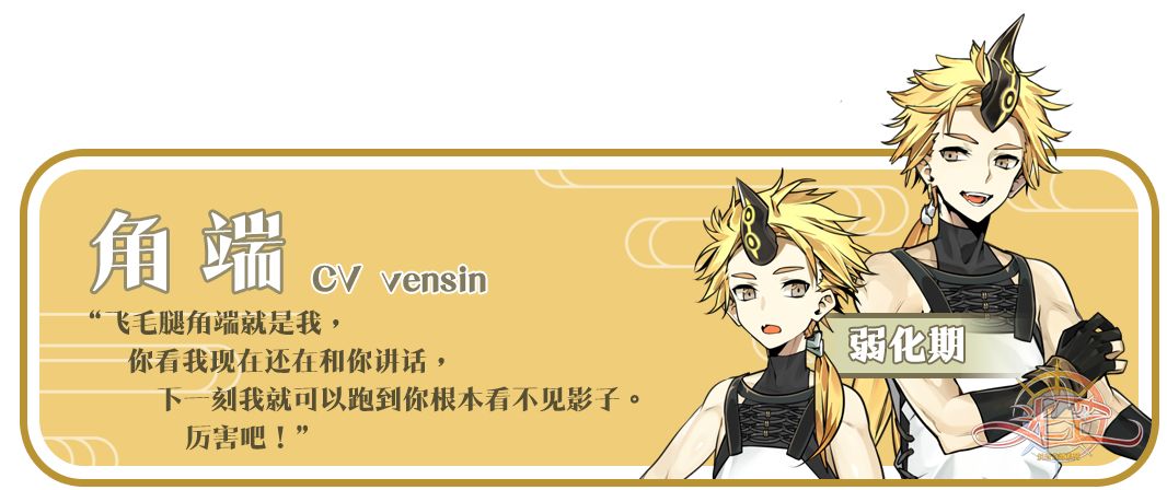 性格:除了让人惊叹的脚程,角端的语速也非常快,还是个话痨,经常在别人还没反应过来的时候就说了一长串,绝对可以把人绕晕。性格和善的角端,几乎可以跟所有的妖怪和谐相处。