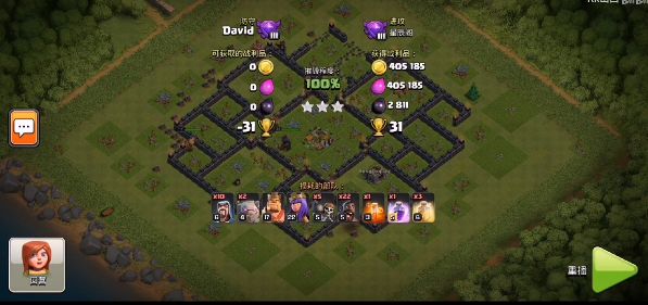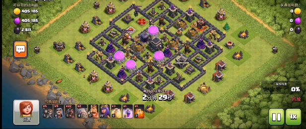 在配兵方面,我们选择22个野猪骑士、2个石头人、9个法师、5个炸弹人、法术方面携带1狂暴法术、3治疗法术、1毒药药水。我们的进攻方法是在西边用小部队也就是两个石头人和9个法师还有双王杀掉敌方对野猪威胁最大的双王。在东边部署野猪大部队,由于东边没有大炸弹的部署位置,东边野猪的进攻无疑最适合。