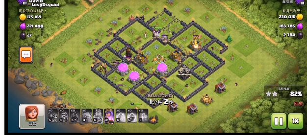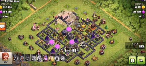 在北边的战事成功的前提下,我们发现该阵东边的布局非常紧凑,毫无疑问没有任何大炸弹的空间,而大炸弹正是对野猪最有威胁的陷阱。所以我们的22只野猪可以肆无忌惮的在该阵东边发起攻击,我们在野猪发起进攻的同时要紧紧的盯着一系列防御建筑并且及时的丢下治疗药水来保住野猪群的血量。