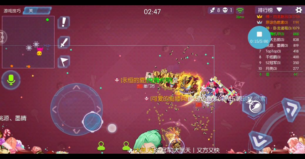 时间来到最后一分钟——00:54,复活后的【夏】左右觅食,寻找最后一击以求翻盘,无奈被Tap、永恒的寒溪大大给盯住了,死追不放。寒溪大大甚至使出大黑天的绝技——隐身,以求可以快速迷惑对手。没想到【夏】却临危不惧,微微一转,露出核心,示敌以弱,再转头一个红色的炸弹,成功逆袭。这一连贯的操作,足矣见得【夏】淡然的心理素质和高超的操作技术呀~