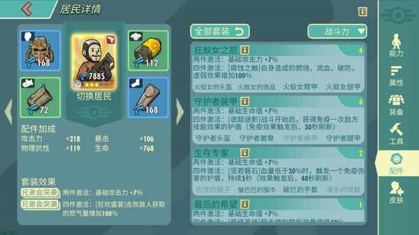 电用来提升建筑等级,水用来提升人物技能,食物用来提升人物等级,瓶盖可以提升装备等级并且购买材料。说到这些资源就要说下扳手和各种资源包,建议开始卡资源并且推图推不动的时候,就把这些提升资源的材料用掉,不要随意使用,也不要攒着(毕竟也不能生蛋)。切记扳手的使用方法为“房间加速次数用完后,点击房间加速功能后启用”,而不可以在仓库处点击“确定”。仓库中部分普通道具的“确定”操作为“卖掉道具”,切记!