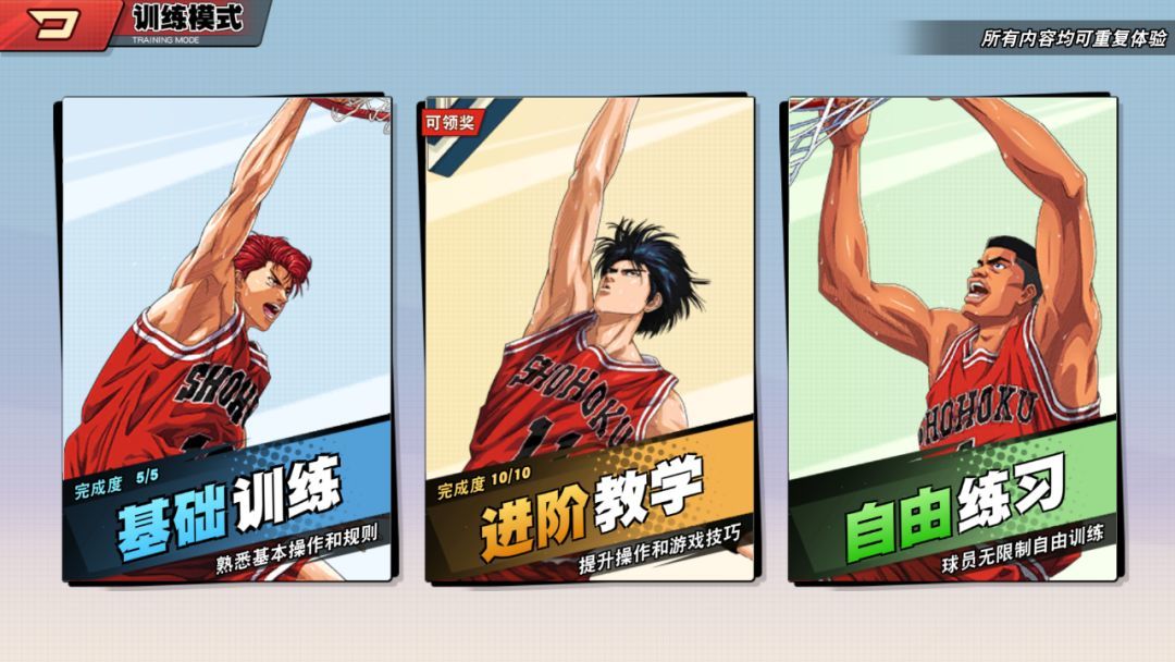 在【训练】模式中,大家可以根据自己的需要,选择“基础”、“进阶”或“自由练习”等训练模式,通过训练来熟悉各球员的技能和游戏的基本操作,萌新们可要在这里多多练习哟~