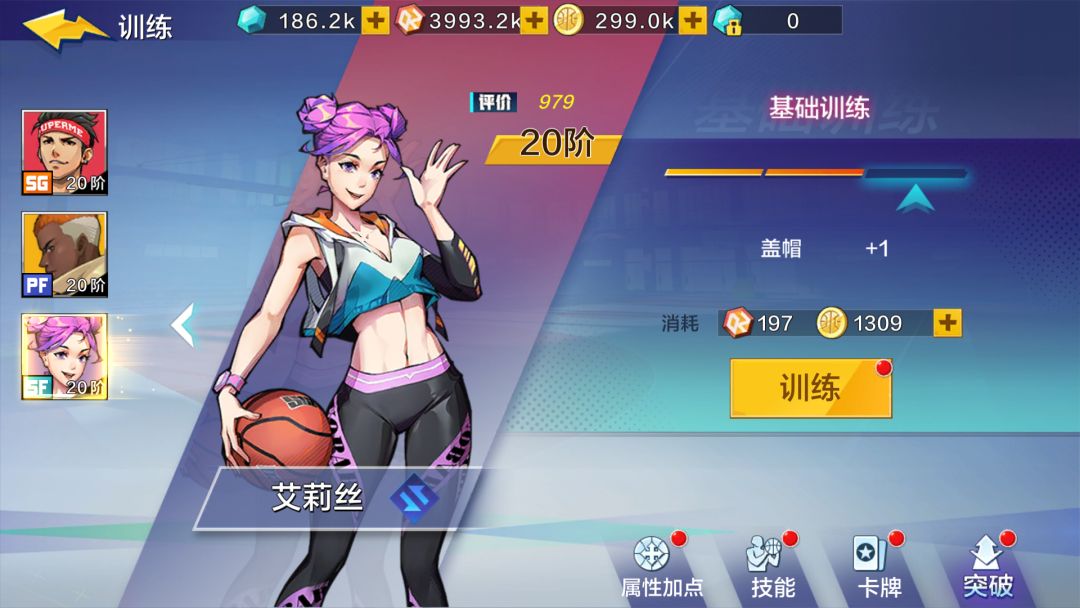 突破型小前锋:上篮强化+突破变向+拉杆上篮+扣篮集中+突破后撤/后仰投篮