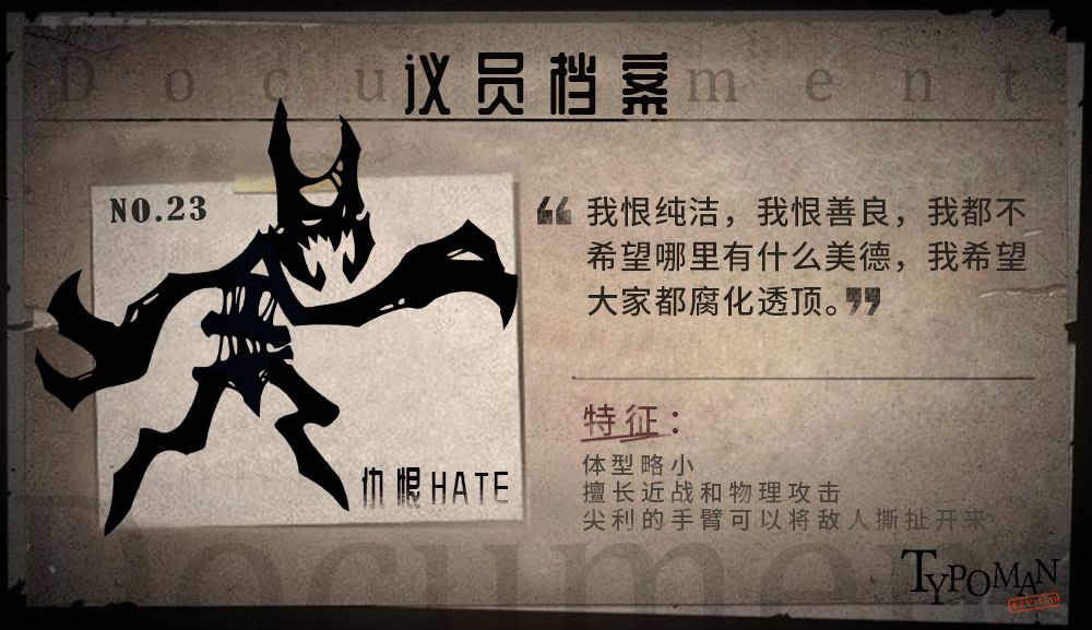 仇恨HATE从战争和压迫中诞生,传递黑暗的情绪和怀疑,是所有人的噩梦,仇恨HATE的情绪越激烈,力量也就越强。