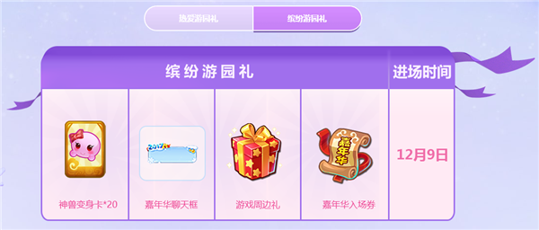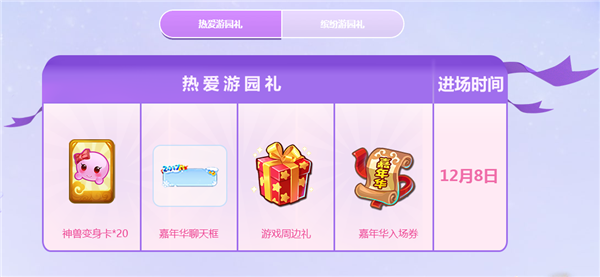 需要注意的是,游园礼包分为两种,分别为不同日期(热爱游园礼12月8日入场、缤纷游园礼12月9日入场)进场,玩家们在购买时要注意挑选时间哟。