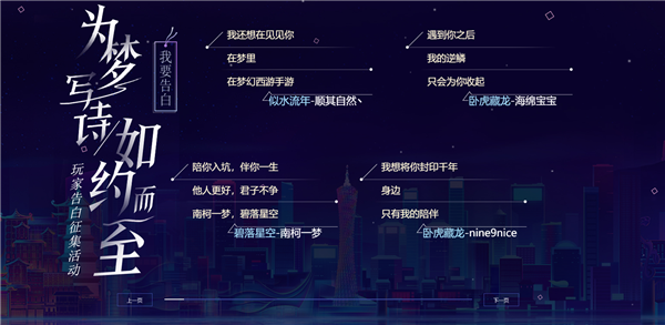 “为梦写诗,如约而至”的告白征集活动已经开启,前往活动页面,即可将梦幻西游中的点滴感动凝于三行情诗,写下你想对游戏里的TA说的话,通过审核后就将显示在活动页面上,与亿万玩家一同分享你的动人回忆。