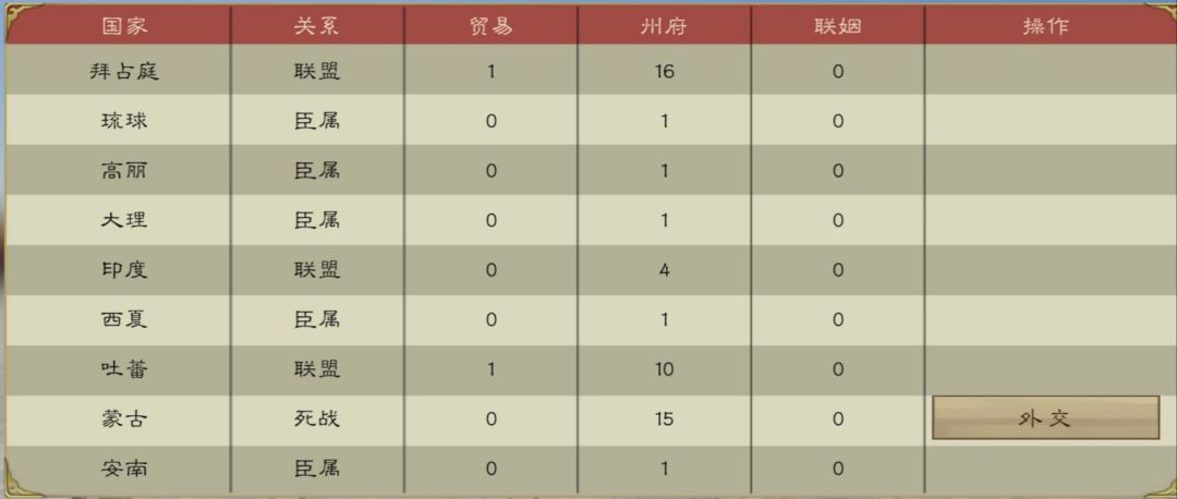 在我强大的国力(银子)之下,周边小国纷纷拜倒,有实力的大国都与我结盟,集合一切力量进攻蒙古。