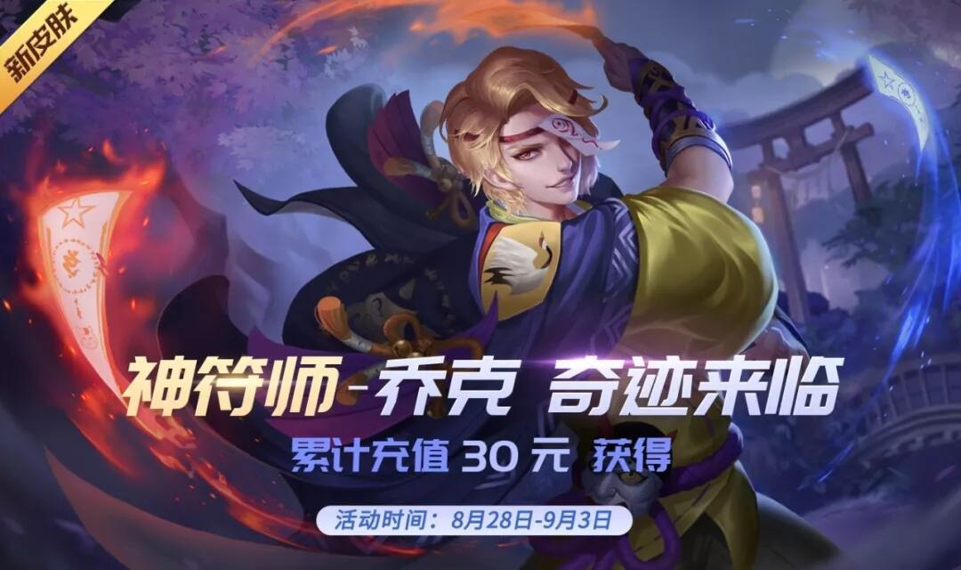 8月28日-9月3日累计充值30元得新皮肤神符师-乔克和一个随机英雄~