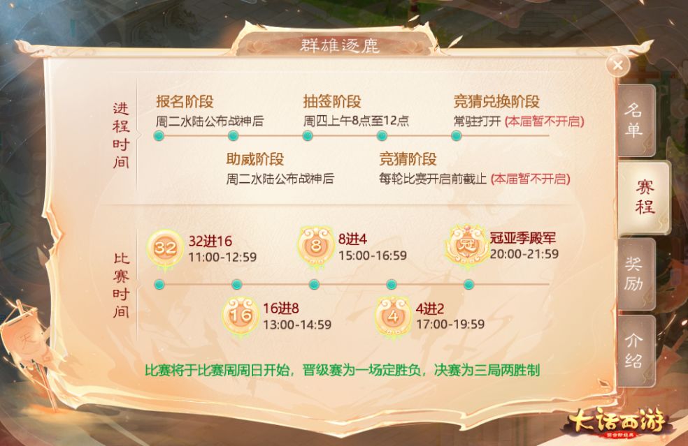 大话手游玩家在游戏中找到长安城NPC群雄逐鹿使者,与他对话并点击选项“群雄逐鹿介绍”→“参赛名单”也可查看参赛服务器名单。所有参赛服务器中获得本届水陆大会积分第一名的玩家将获得此次群雄逐鹿大赛的报名资格,使用道具【群雄召集令】即可作为队长组齐5人队伍进行报名参赛。