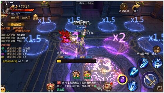 激情闭关开启后玩家进入场景后会出现在安全区,在地图中玩家可以获得经验和威望。一段时间后,在地图的危险区会出现一些光圈,玩家角色进入光圈后会有一定倍数经验和威望加成,玩家可以在危险区为争夺光圈进行PK,活着的角色可以继续待在光圈内享受多倍的经验和威望。
