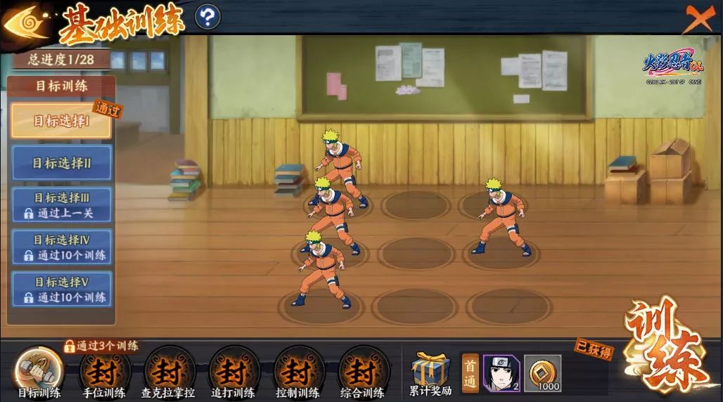 在基础训练中,需要训练的有手位训练、查克拉掌控训练等,目前一共有28个关卡。