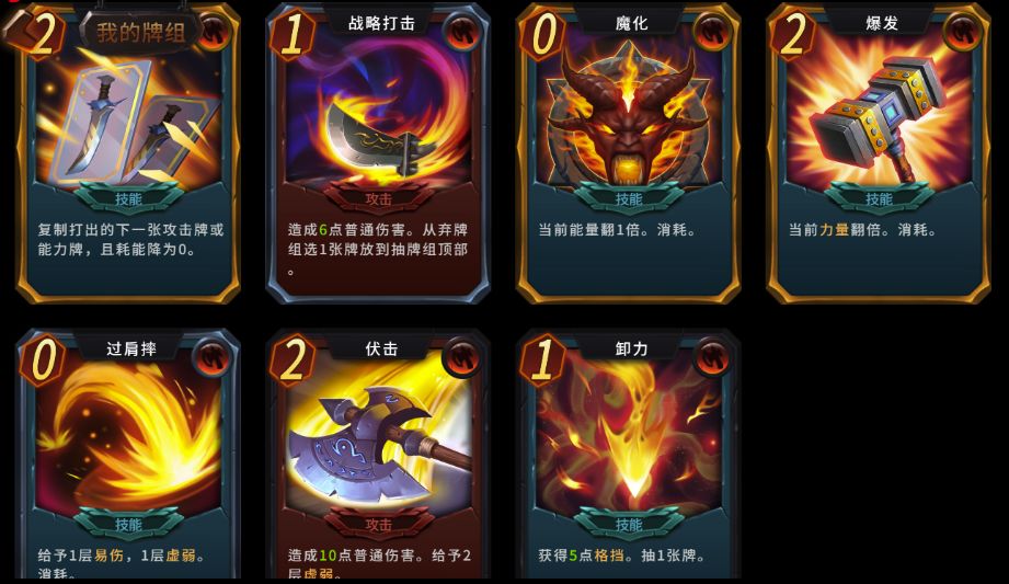 2、我的卡牌池,最后一共17张,略多,没忍住拿了一些没用的。