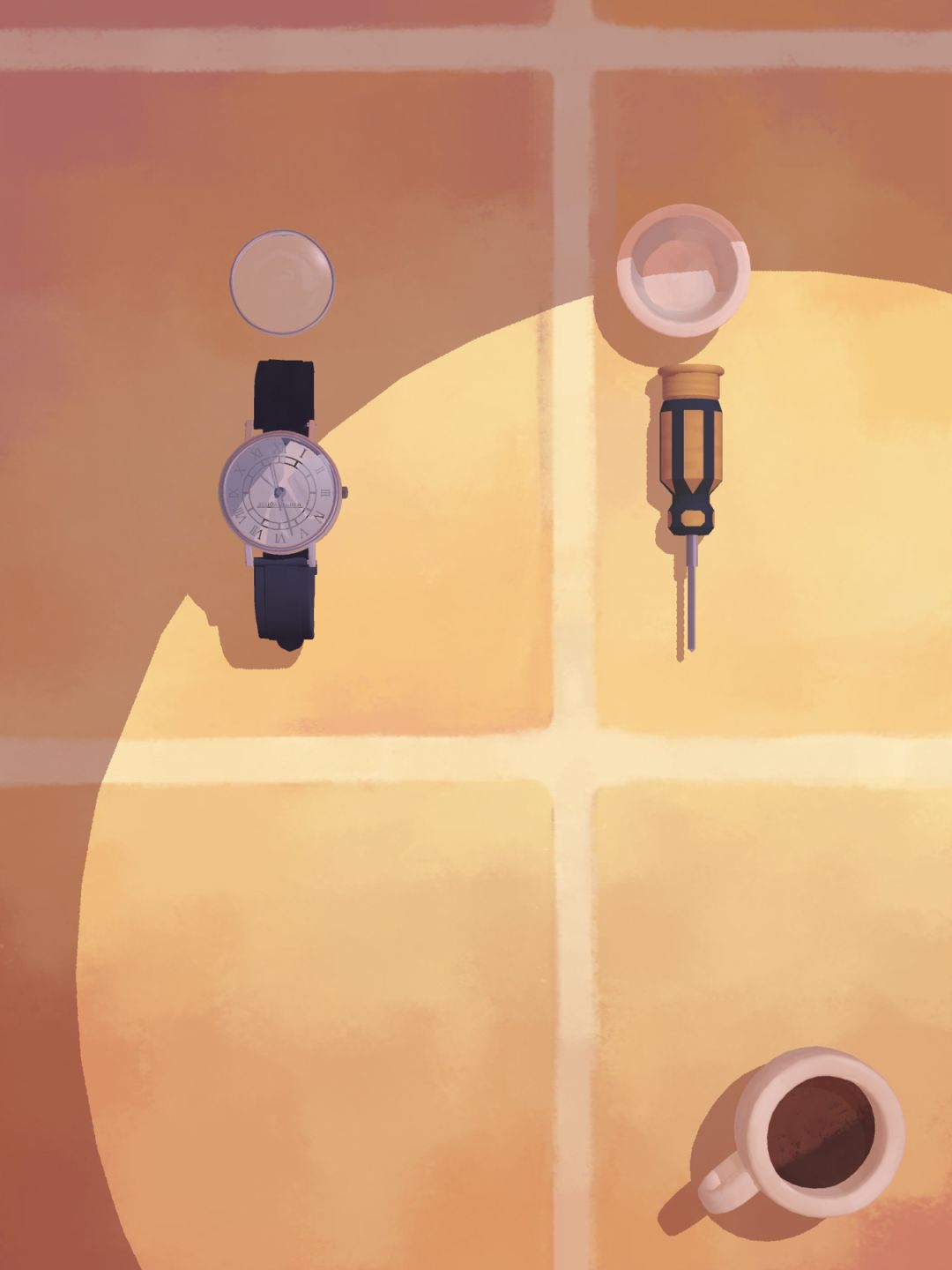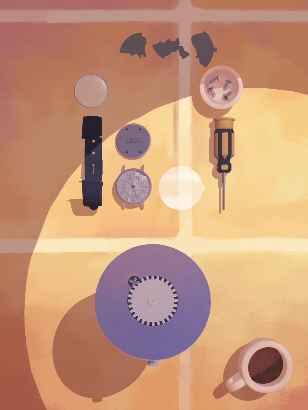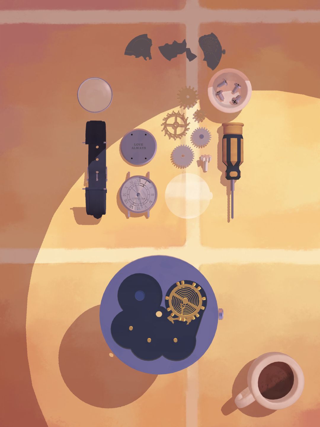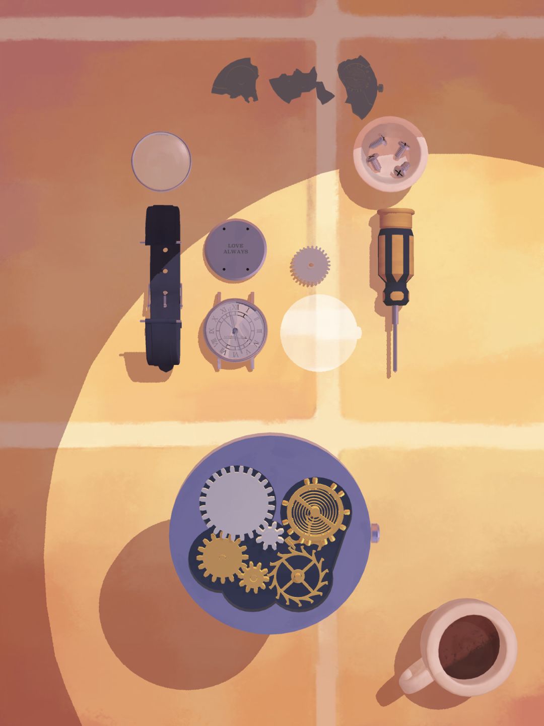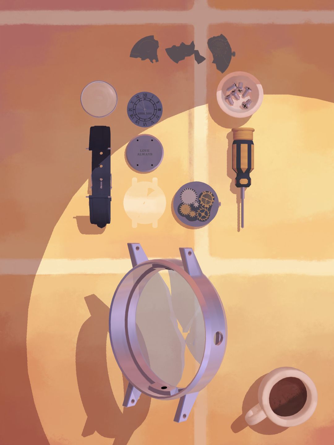 然后把所有的物件全都拆封出来,相信大家都会的,卸掉表带,用螺丝刀把螺丝拧下来,把所有的部件都分开放在桌上。