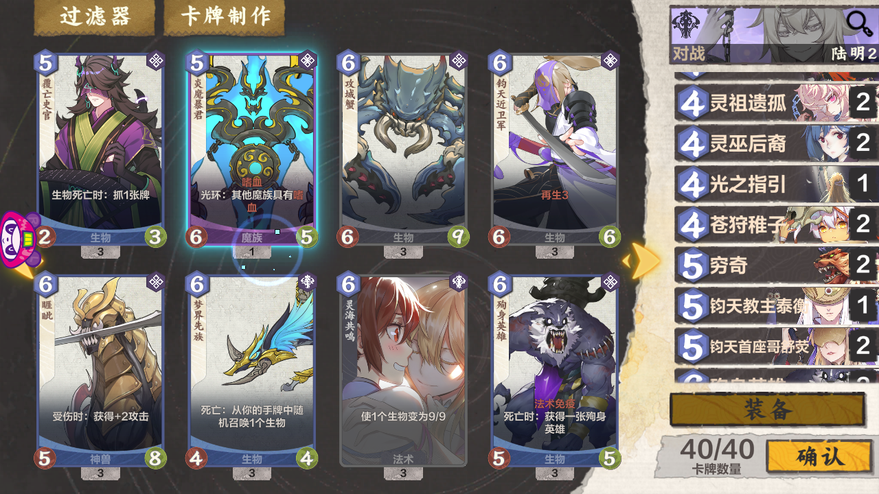 为了克服2c的问题,我们选择加入噩兆先知,对于灵属性卡组来说,噩兆先知并不像在水或者火属性卡组中那么优秀,但是作为一张2c的特效生物,依然应当被使用如若拉出具有进场效果的生物,自然是很好,即使拉不出来也是一个有效地阻挡者。而且在后期也可搭配誓仇孤子的效果,使其在战斗前便可启动一次。而4c的拜龙教祭祀则是一张高效的恢复卡。444的拜龙教祭祀可以在生物死亡时为自己恢复2点生命,关键的一点是拜龙教祭祀的效果是针对双方场面的,因此即使时对方生物死亡也会为自己恢复生命,这可以让我们更好的加强抗打击能力,而其444的身材也同样是一个优秀的阻挡者。