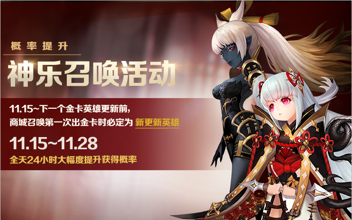 卧虎藏龙特色英雄神乐降临艾伊莎大陆。为了庆祝她的加入,活动期间,在召唤商城抽取神乐的召唤概率大幅度提升。