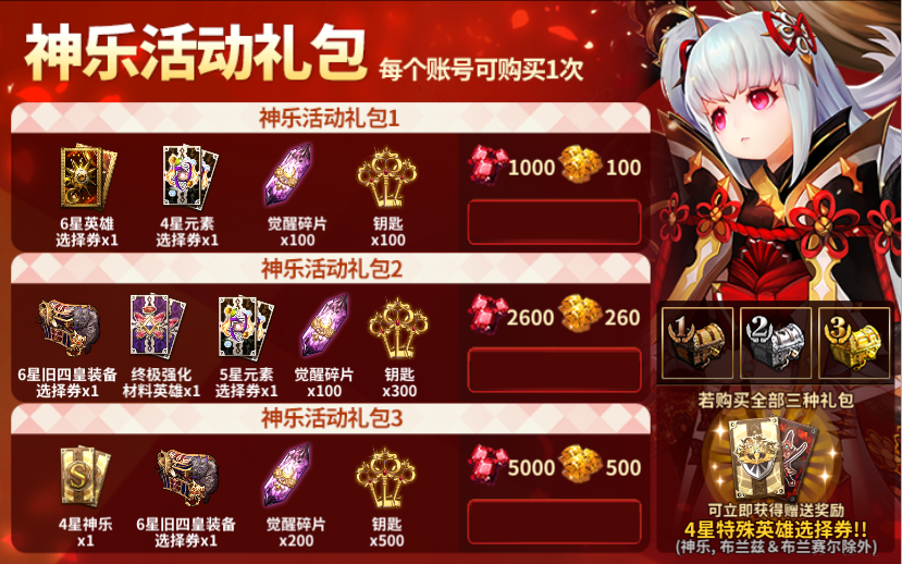 礼包全部购买将额外赠送4星特殊英雄选择券*1(神乐、布兰兹&布兰赛尔除外)