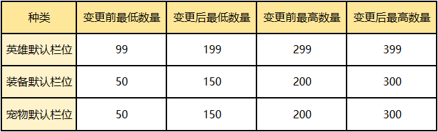 -英雄,装备,宠物扩展背包礼包数量更正,礼包价格不变。