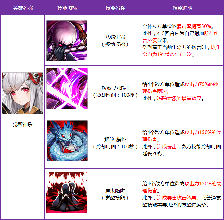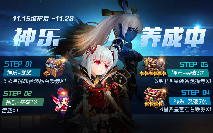 神乐作为八蛇剑的监视者,一直在守卫八蛇剑封印,封印松动后,她也被诅咒了。为了解除诅咒,她开始寻找让她的巫女之力苏醒的力量。活动期间内,觉醒并养成神乐可以获得4星四皇宝石召唤券等奖励。