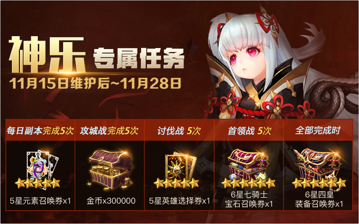 诅咒巫女·神乐觉醒降临,如果要苏醒巫女之力还需要面对重重挑战,完成所有任务即可获得6星四皇装备召唤券奖励。祝愿神乐早日成功降临在骑士的队伍中。