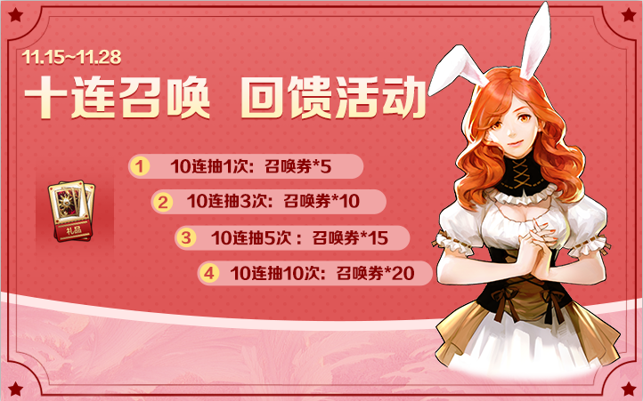 活动期间内,进行十连召唤可以享受召唤回馈活动的优惠,额外获得高级英雄召唤券奖励。进行10次十连抽,累计可获得5次十连抽召唤券的奖励。