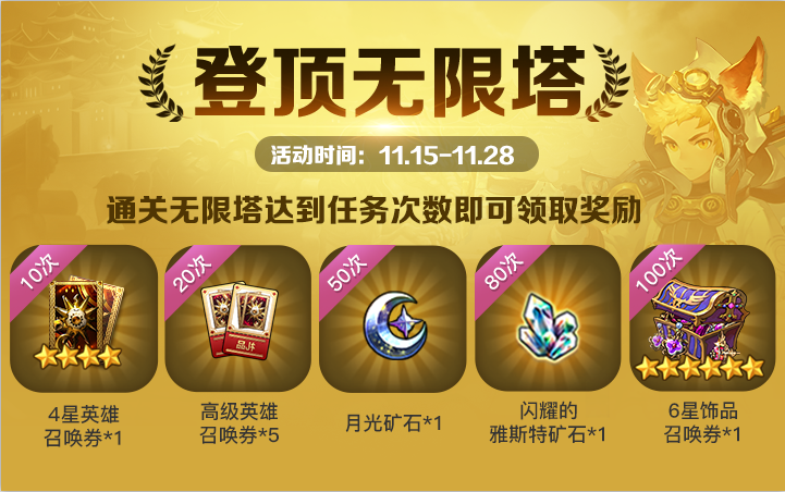 金秋时节,正是丹桂飘香、风霜高洁之际,宜登高望远,抖擞精神。登顶无限塔活动也同步开启,登上无限塔一览群峰吧。挑战无限塔一定次数即可获得包括6星饰品召唤券在内的丰富奖励。