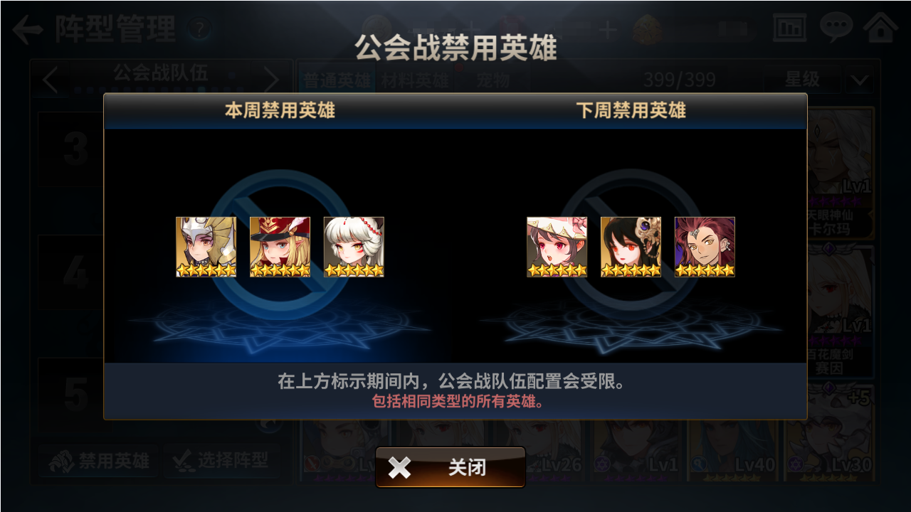 现在的阵型中包括禁止英雄时,显示【目前预备战队已包括下周禁止英雄。请提前配置公会战队伍。】